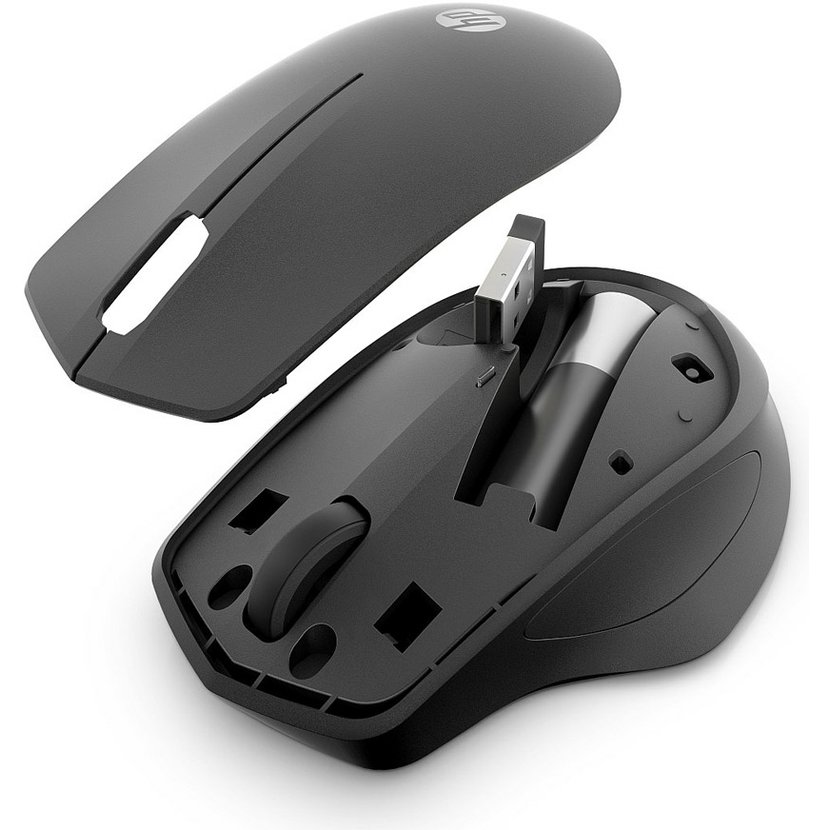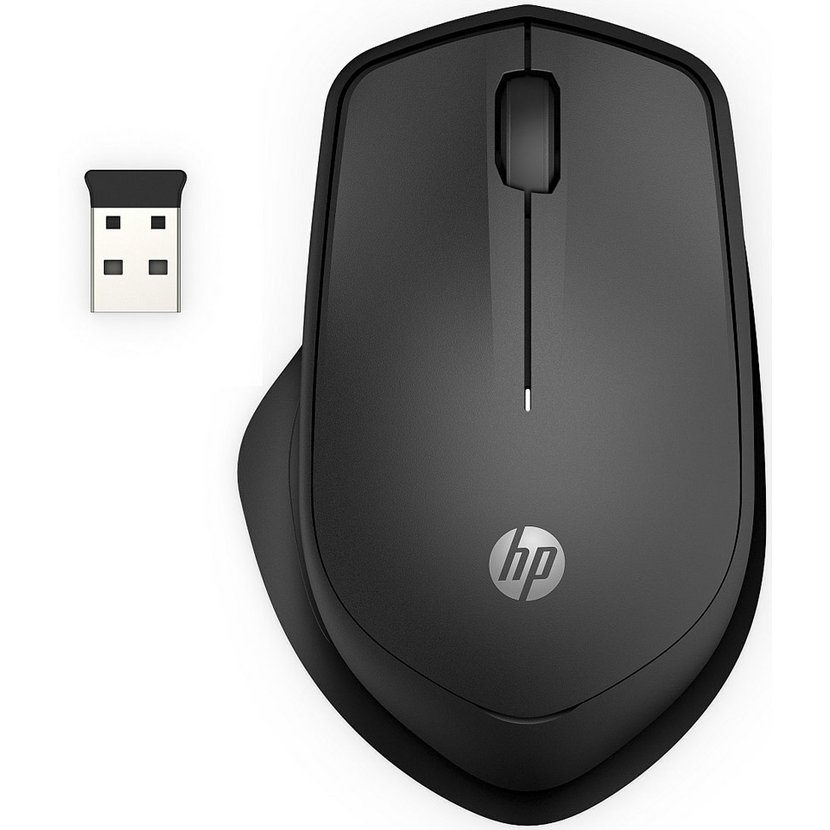 Co je obsaženo v krabici: HP 285 Silent Wireless Mouse, Bezdrátový USB přijímač, 1× AA baterie, Dokumentace