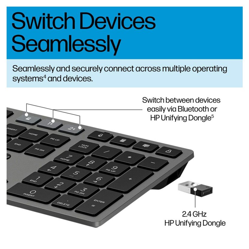 Využívejte bezproblémové a zabezpečené připojení k různým operačním systémům 4 a zařízením – dvěma přes rozhraní Bluetooth a jedním přes 2,4GHz modul HP Unifying Dongle. Pomocí klávesy pro více zařízení na této klávesnici můžete také snadno přepínat připojená periferní zařízení z jednoho počítače na druhý.