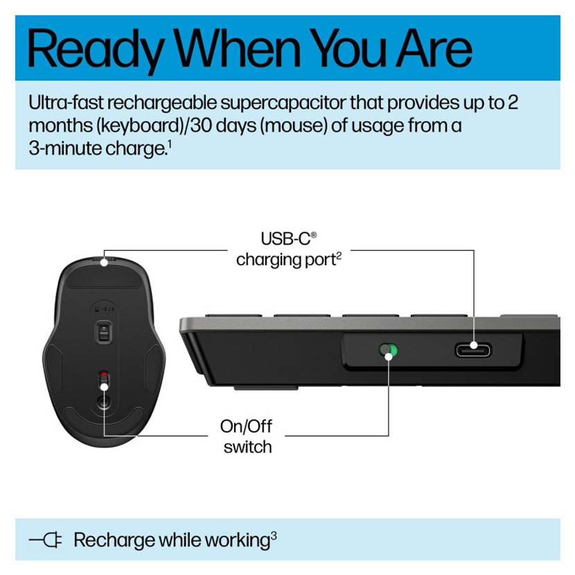 Zbavte se baterie a pracujte bez starostí s ultrarychlým nabíjecím superkondenzátorem, který poskytuje až 2 měsíce (klávesnice)/30 dní (myš) používání po 3 minutách nabíjení. Nebo můžete nabíjet při práci pomocí kabelu USB-C a psát bez přerušení.