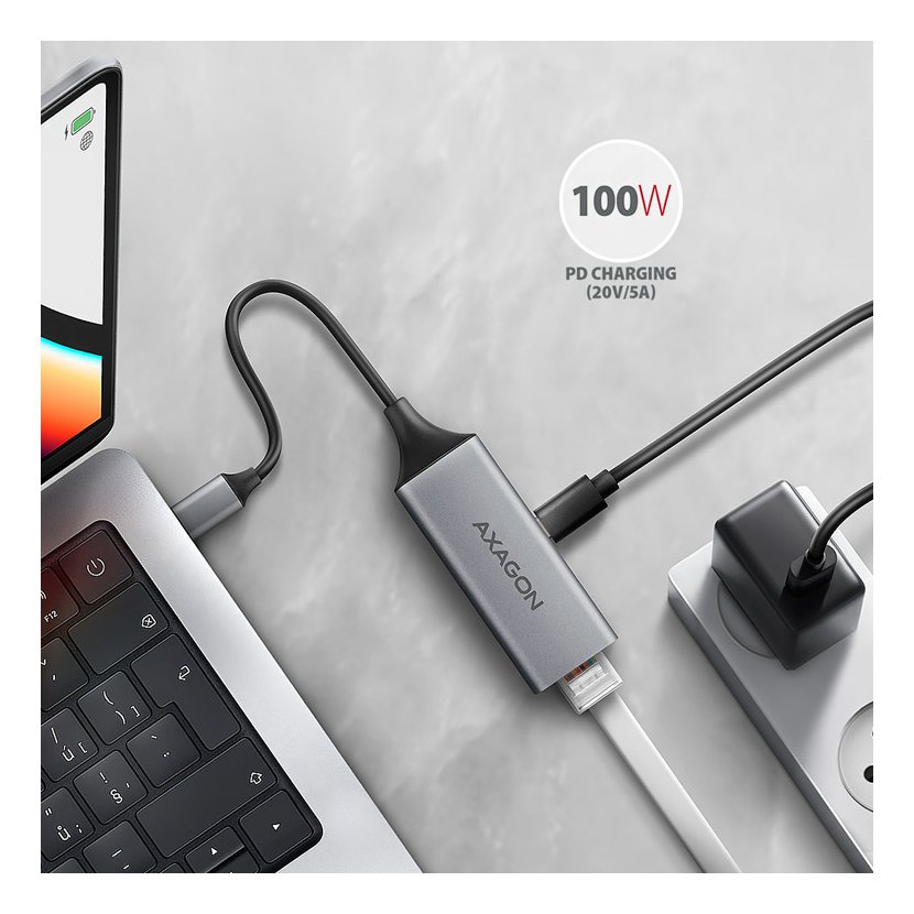 Externí síťová karta AXAGON ADE-TXPD s konektorem USB-C PD 100W snadno přemění USB-C port na Gigabit Ethernet port. Adaptér může doplnit chybějící síťový RJ-45 konektor, přidat další síťovou kartu nebo nahradit původní nefunkční síťové připojení. Velkou výhodu představuje integrovaný konektor Power Delivery, který umožňuje připojení nabíječky a tím poskytuje možnost napájení notebooku. Díky 15 cm kabelu s USB-C koncovkou můžete připojit Ethernet adaptér k jakémukoliv počítači, tabletu nebo telefonu.