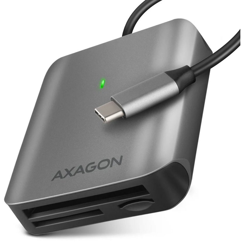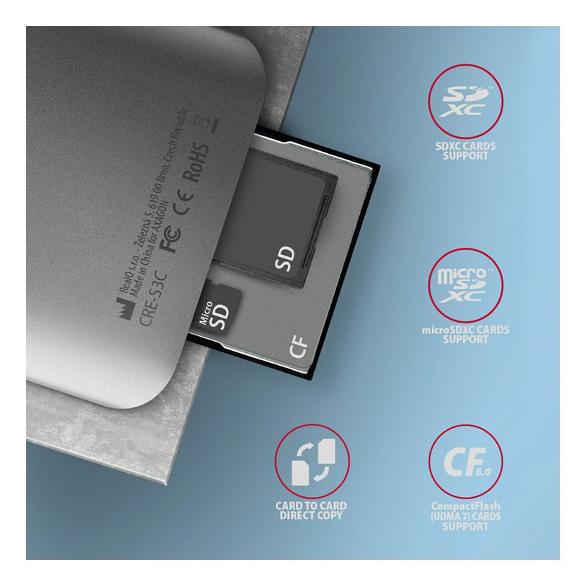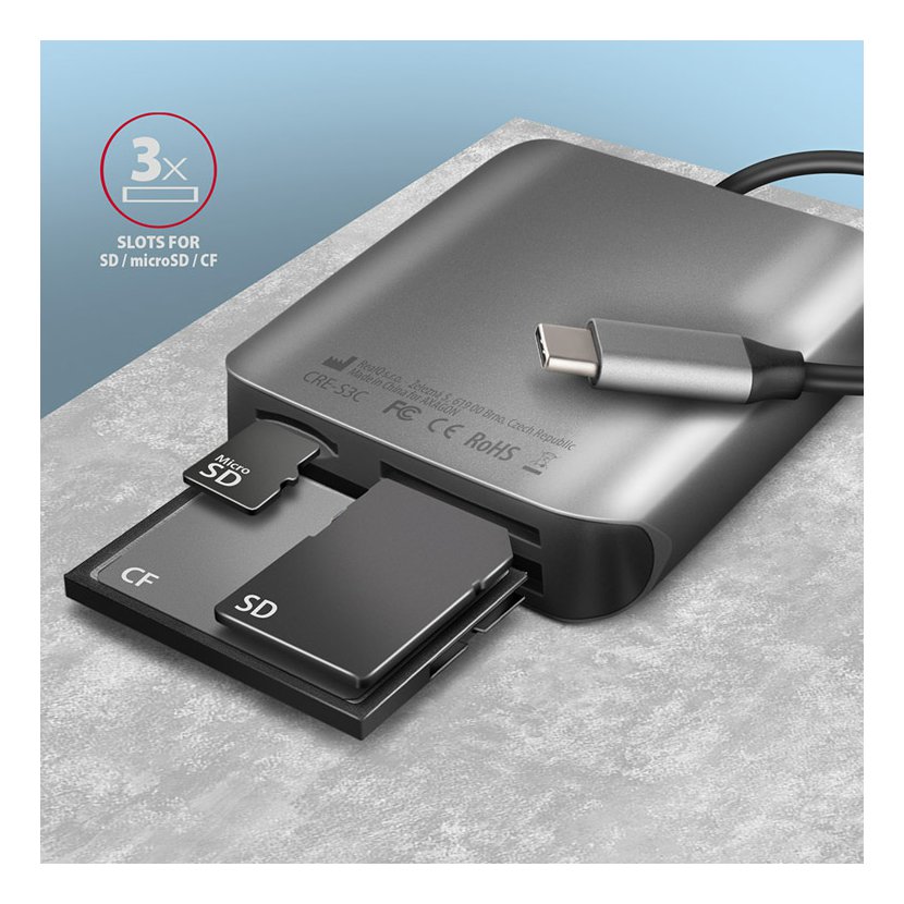 Hliníková 3in1 čtečka paměťových karet AXAGON CRE-S3C SUPERSPEED s USB 3.2 Gen 1 rozhraním podporuje všechny současné verze SD a microSD karet včetně SDXC a microSDXC s kapacitou až 2TB. Dále podporuje CF karty o kapacitě až 128PT. Díky modernímu oboustrannému USB-C konektoru čtečku snadno připojíte k notebooku, telefonu nebo počítači s USB-C konektorem.