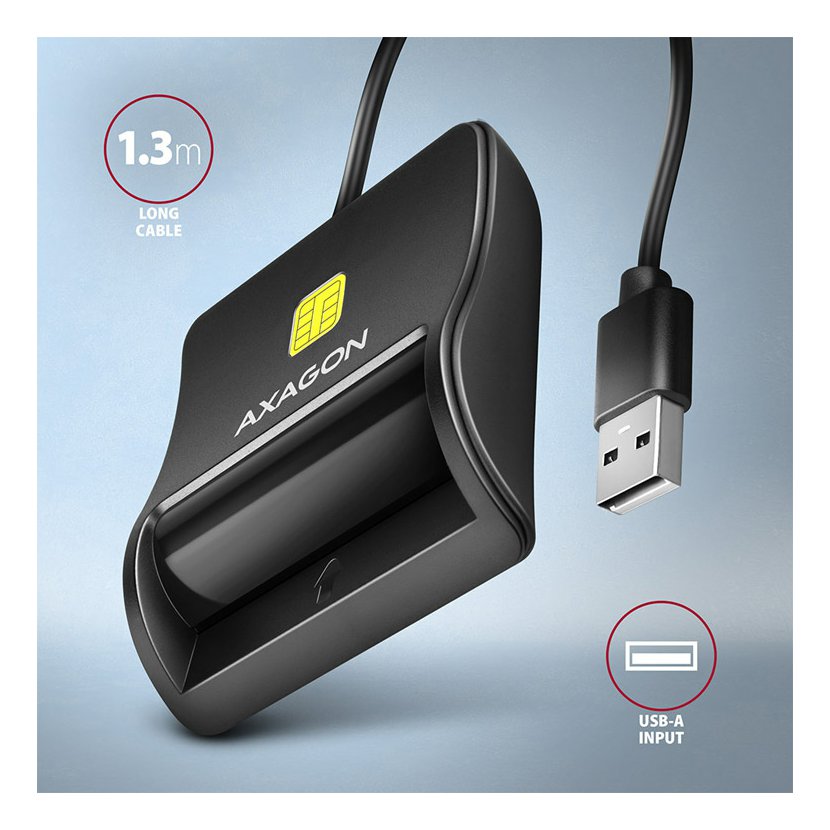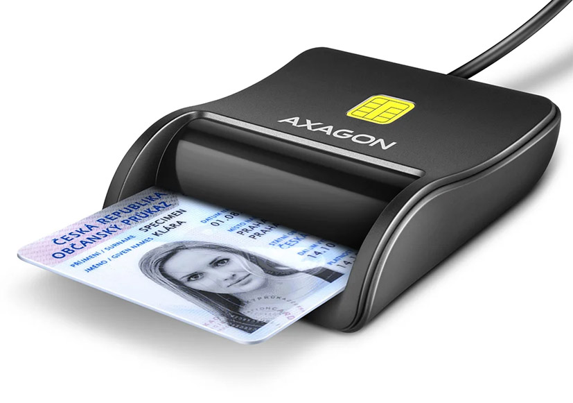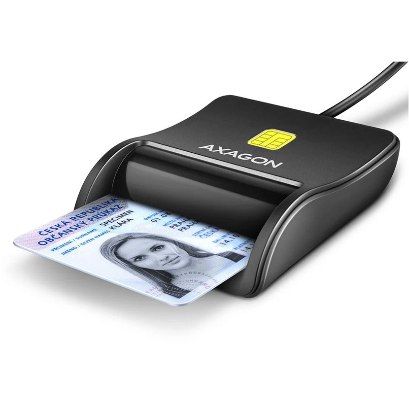 Kompaktní stolní čtečka Smart card / ID card AXAGON CRE-SM3N FlatReader s USB 2.0 rozhraním. Card reader podporuje všechny běžné formáty kontaktních Smart karet, čipových karet a dalších karet včetně kontaktních bankovních platebních karet nebo kontaktních elektronických občanských průkazů *. Čtečka je plně kompatibilní s aplikací eObčanka.