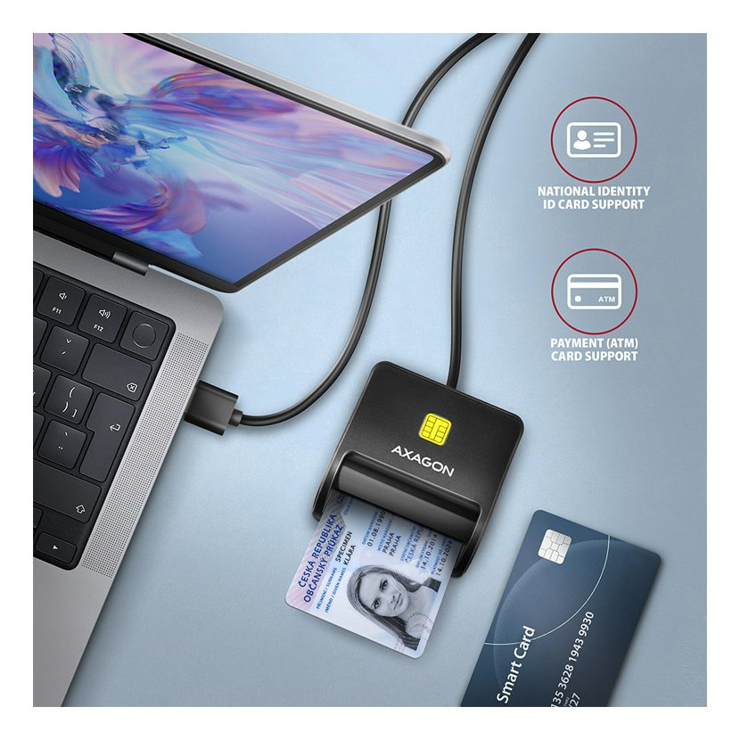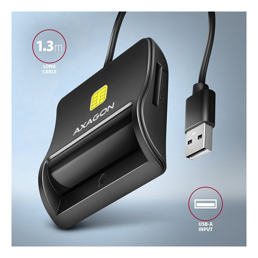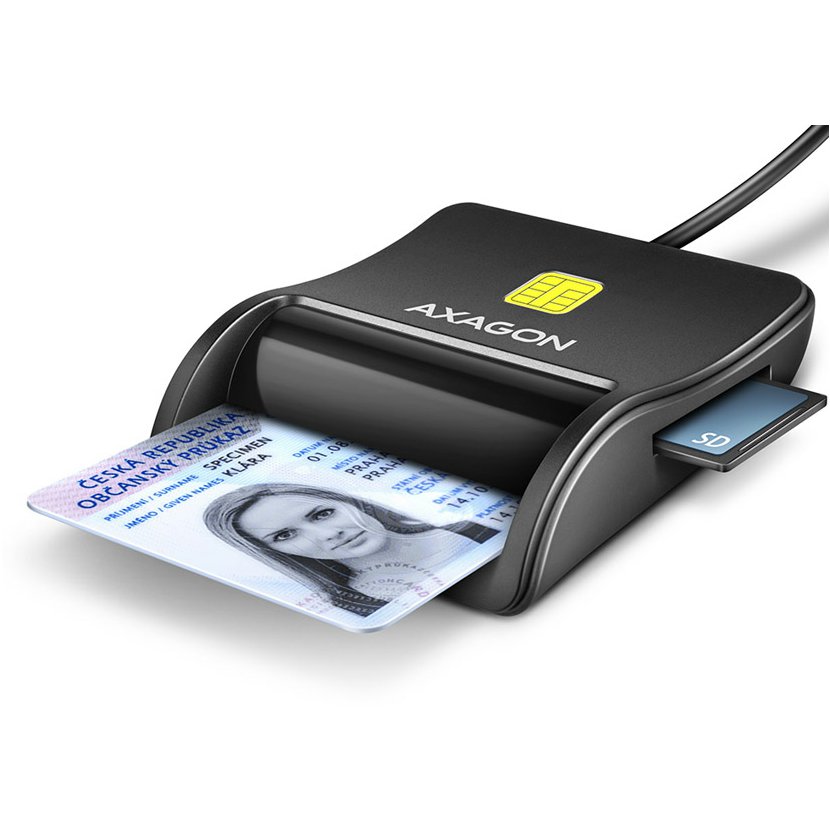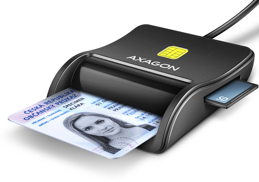 Kompaktní stolní čtečka Smart card / ID card AXAGON CRE-SM3SD FlatReader s USB 2.0 rozhraním obsahuje navíc sloty pro paměťové karty SD, microSD a SIM karty. Card reader podporuje všechny běžné formáty kontaktních Smart karet, čipových karet a dalších karet včetně kontaktních bankovních platebních karet nebo kontaktních elektronických občanských průkazů *. Čtečka je plně kompatibilní s aplikací eObčanka.
