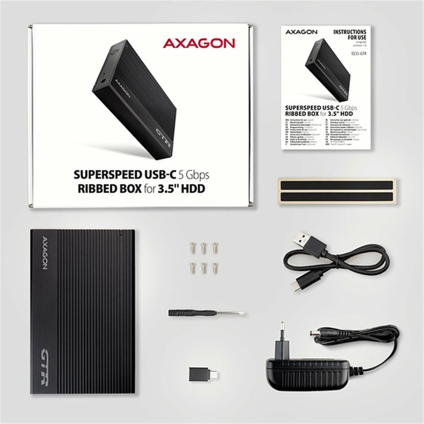 Žebrovaný hliníkový externí AXAGON EE35-GTR RIBBED box s USB-C 5Gbps rozhraním určený pro 3.5" SATA pevné disky. Spolehlivé připojení k počítači umožňuje oboustranný USB-C konektor na boxu spolu s dodávaným kabelem USB-C -> USB-A a redukcí USB-A -> USB-C.