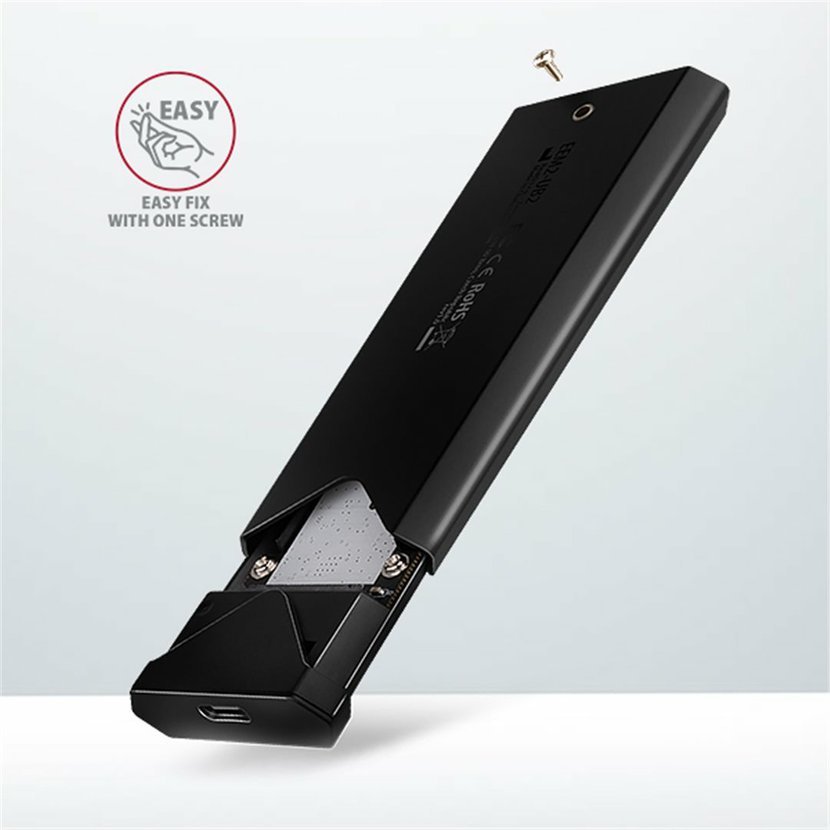 Otevírání boxu pouze přes jeden šroubek usnadňuje montáž i demontáž M.2 SSD disku. Výměna disků je rychlá a snadná a rozšiřuje tak možnosti využití boxu např. pro migraci dat, testování atd.