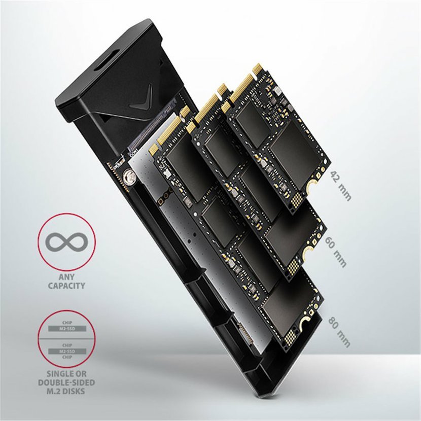 Výhodou je uchycení rovnou pro tři různé délky SSD disku - 42, 60 a 80 mm. M.2 disků mohou být jednostranné nebo oboustranné. Box nemá omezení kapacity vloženého SSD disku.