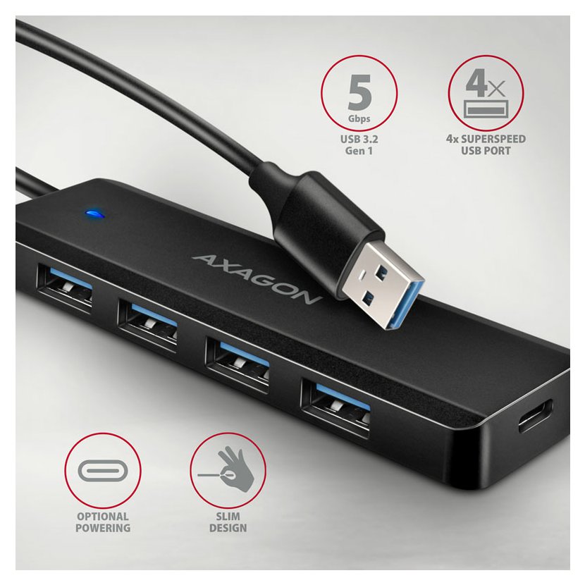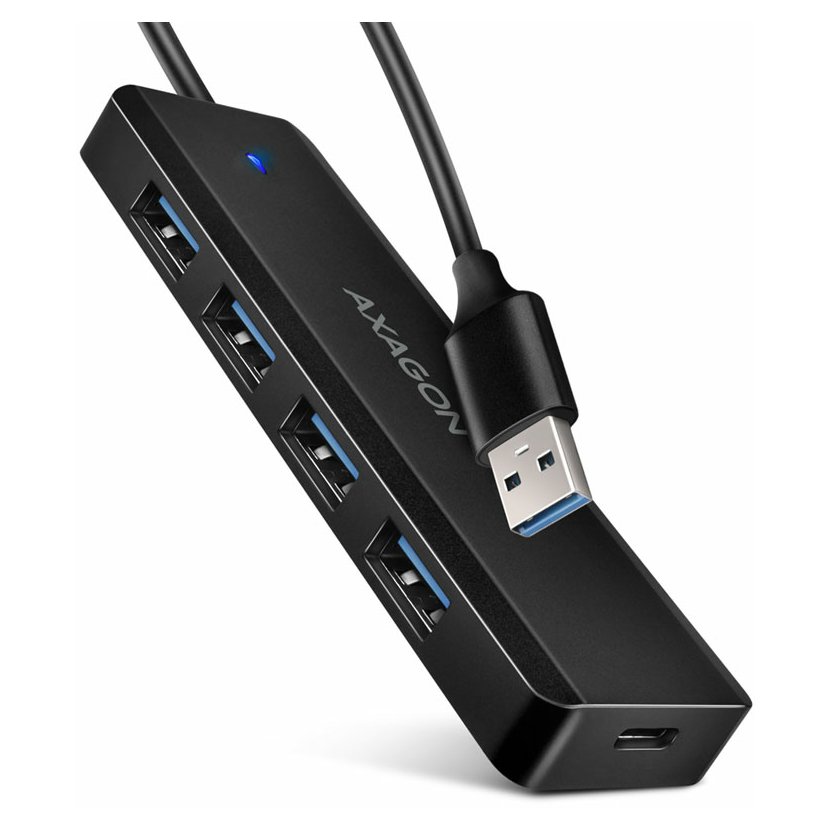 AXAGON HUE-C1A - 4x USB 5Gbps TRAVEL hub, USB-C napájecí konektor, kabel USB-A 19cm