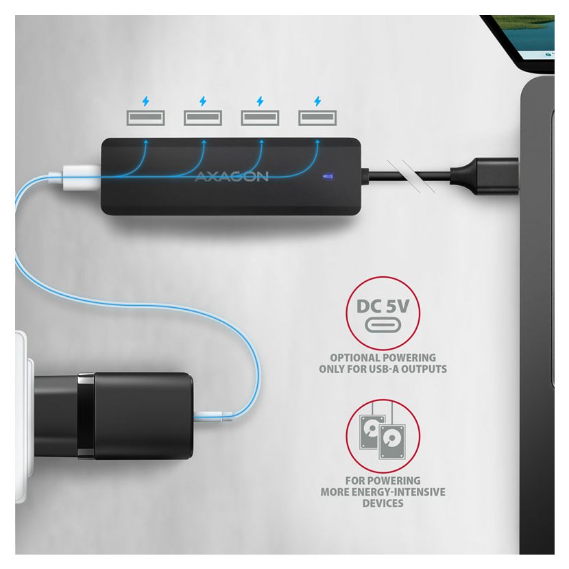 Všestrannost tohoto kompaktního USB hubu zvyšuje vestavěný USB-C konektor pro dodatečné napájení ze standardních USB nabíječek dodávaných k mobilním telefonům. Díky tomuto přídavnému napájení lze například připojit ještě více externích disků k počítači nebo zvýšit počet nabíjených mobilních telefonů. I bez externího napájení hub zvládne trvalé připojení několika externích disků.