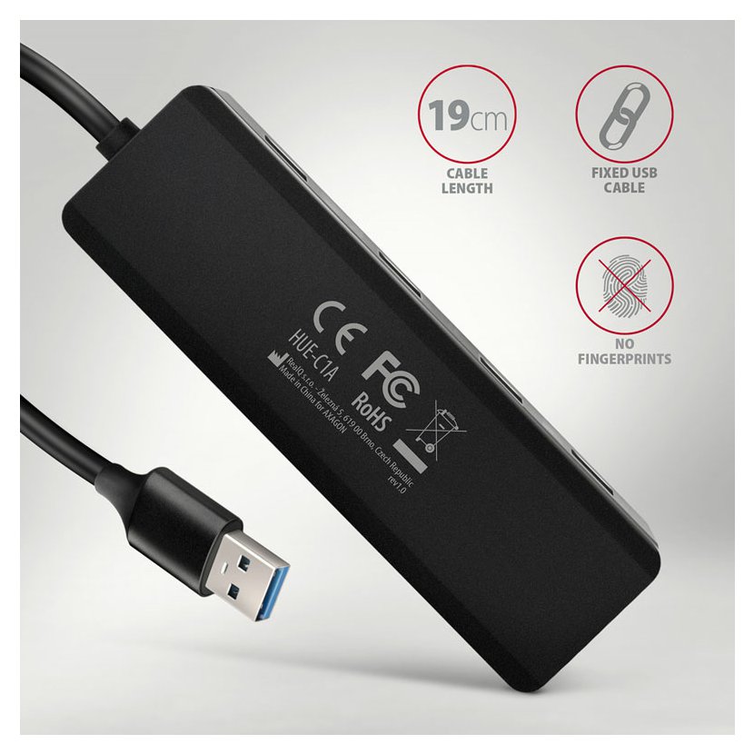 Cestovní USB-A 5Gbps hub AXAGON HUE-C1A snadno a rychle připojí k notebooku nebo počítači až čtyři USB zařízení současně. Napevno uchycený USB-A kabel délky 19 cm je ideální pro uživatele mobilních zařízení. Standard USB 3.2 Gen 1 umožní přenosovou rychlost až 5Gb/s.