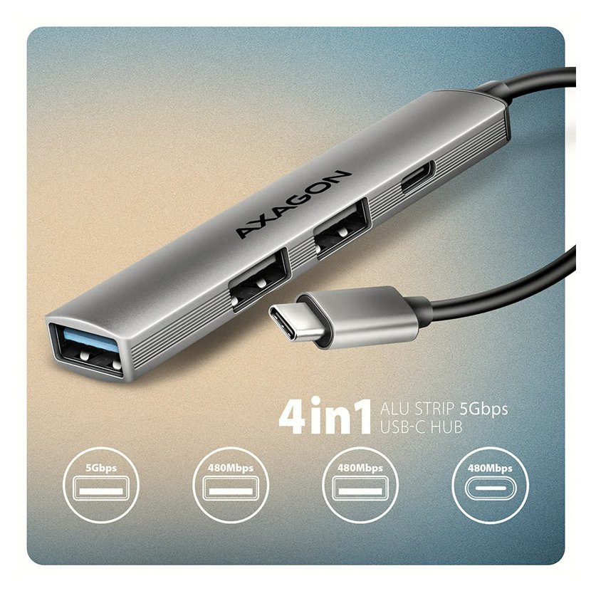 AXAGON HUE-STC - 4x USB ALU STRIP hub, 1x USB-A 5Gbps, 2x USB-A & 1x USB-C 480Mbps, kabel USB-C 12cm