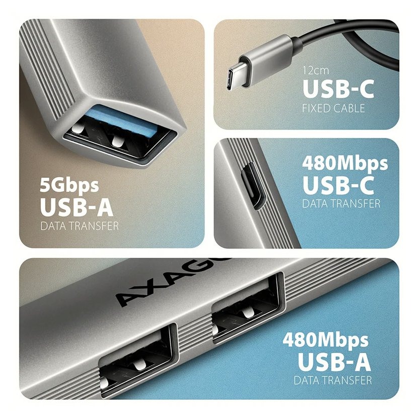USB rozbočovač nabízí čtyři USB výstupy - jeden USB-A 5Gbps, ideální pro rychlé připojení externích disků či flash pamětí. Dva standardní USB-A 480 Mbps výstupy jsou dostačující pro spolehlivé připojení myši, klávesnice nebo tiskárny. Čtvrtý USB-C 480Mbps datový konektor umožňuje připojení většiny mobilních telefonů a dalších zařízení s běžnou přenosovou rychlostí.