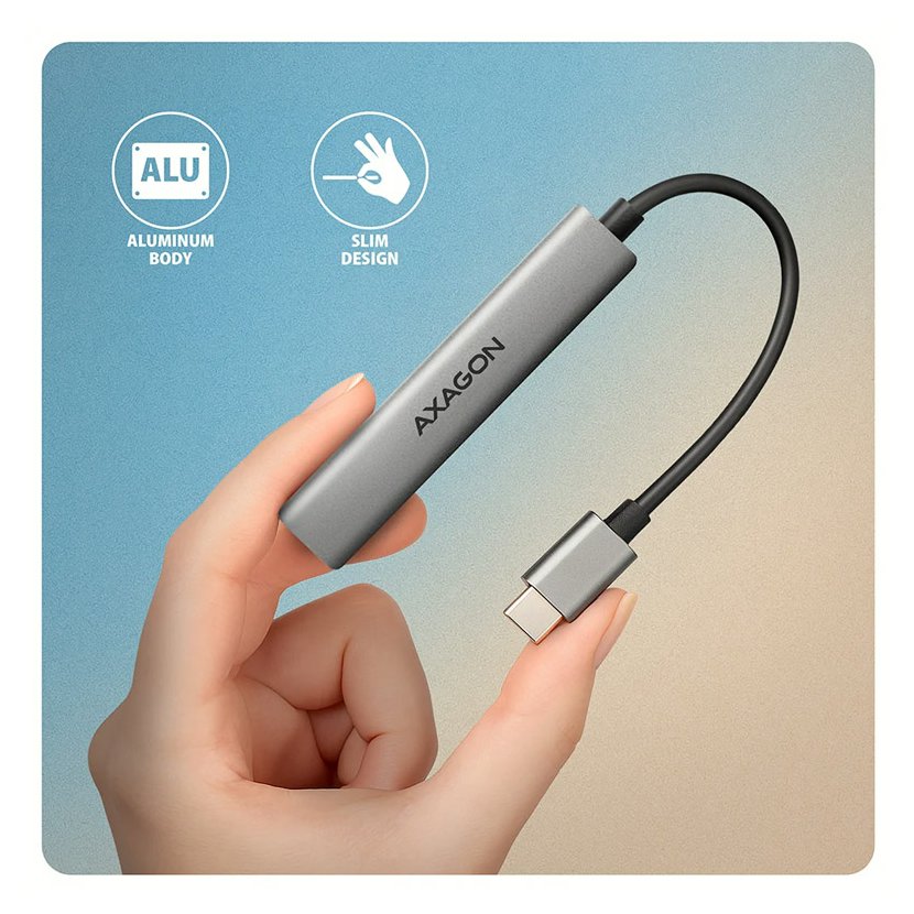 Tenký hliníkový USB-C 5Gbps AXAGON HUE-STC ALU STRIP hub snadno a rychle připojí k notebooku, počítači nebo telefonu až čtyři USB zařízení současně. Váš notebook připojíte k hubu přes 12 cm dlouhý USB-C kabel.