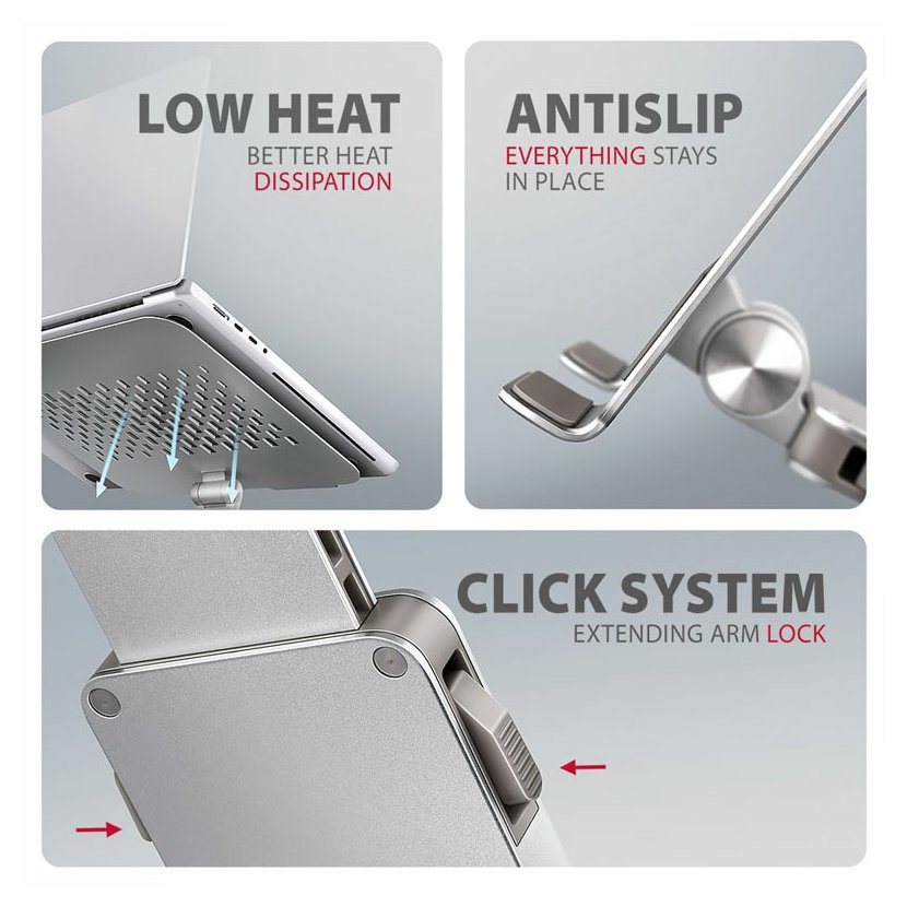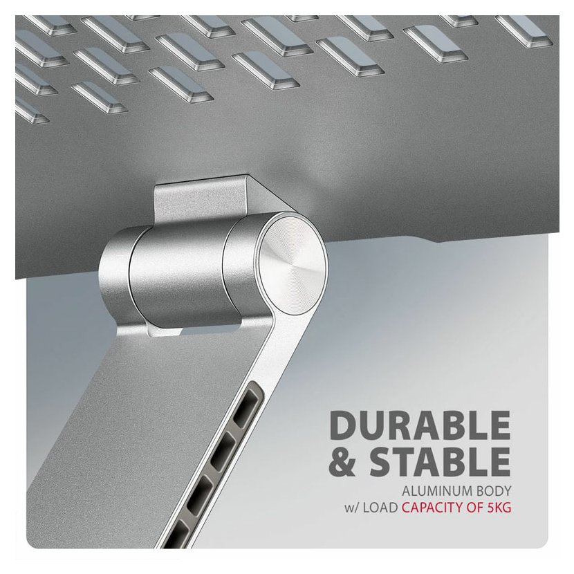 Podstavec pro notebook je vyroben z robustních hliníkových odlitků garantujících dlouhou životnost a spolehlivost. Díky protiskluzové úpravě zůstane vaše zařízení bezpečně na svém místě bez rizika nechtěných pohybů, aniž by došlo k jakémukoliv poškození povrchu notebooku nebo podložky. Tyto pečlivě navržené vlastnosti zaručují perfektní stabilitu pro váš notebook, tablet nebo oblíbenou knihu, což vám poskytne klid a pohodlí při každodenním používání.