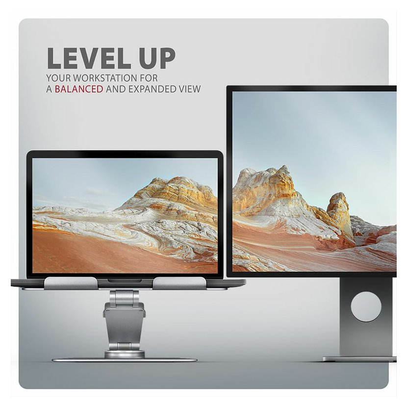 360° mechanismus umožňuje otočení celého ramene s notebookem okolo své osy. Tato funkce zajišťuje maximální flexibilitu - snadno změníte orientaci notebooku, aniž byste museli stojan přemisťovat. To oceníte zejména při práci v omezených prostorech, nebo při sdílení obrazovky notebooku při obchodních jednáních, poradách nebo prezentacích.