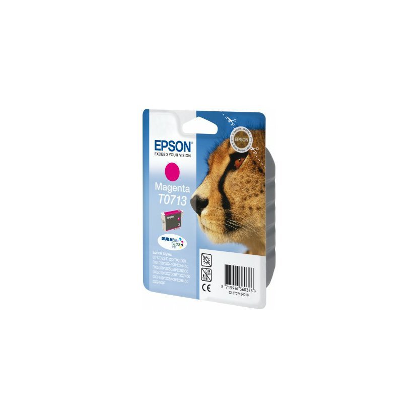 T0713 - inkoustová kazeta kompatibilní s EPSON Stylus dx4000, EPSON Stylus dx4450, EPSON Stylus DX5000, EPSON Stylus DX5050, EPSON Stylus DX6000, EPSON Stylus DX6050, EPSON Stylus DX7000F, EPSON Stylus dx7400, EPSON Stylus dx7450, EPSON Stylus dx8400, EPSON Stylus dx8450, EPSON Stylus dx9400F, EPSON Stylus SX600FW, EPSON Stylus Office BX600FW, EPSON Stylus SX400, EPSON Stylus SX405, EPSON Stylus SX100, EPSON Stylus SX105, EPSON Stylus SX200, EPSON Stylus SX205, EPSON Stylus 218, EPSON Stylus SX510W, EPSON Stylus SX515W, EPSON Stylus S20, EPSON Stylus D92, EPSON Stylus D78, EPSON Stylus D120 s kapacitou 5,5 ml a uváděnou výtěžností až 495 stran při pokrytí stránky 5%