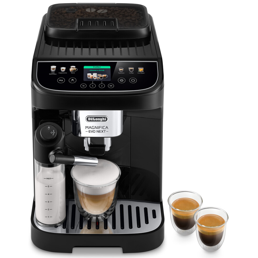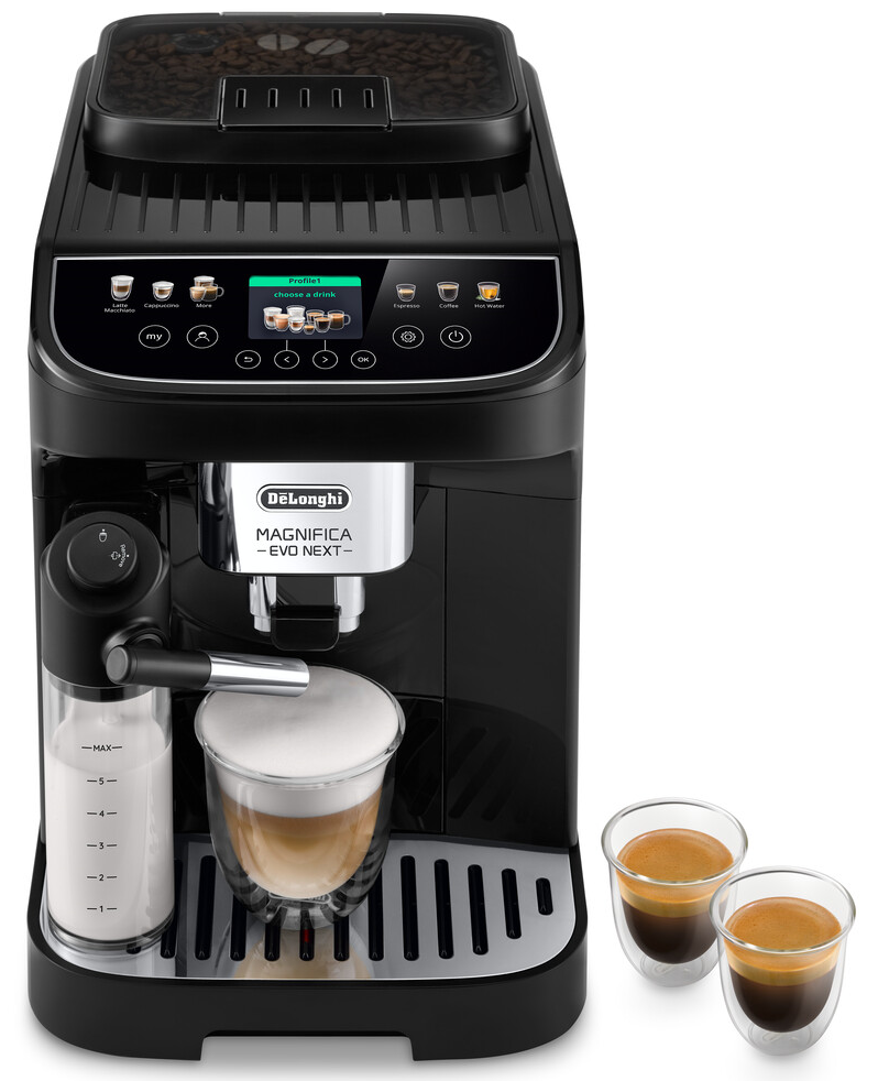 Magnifica Evo Next je ztělesněním zkušeností, know-how a inovativních technologií De‘Longhi, které vždy zajistí ten nejlepší výsledek v šálku. Uspokojí chuť na jakoukoli kávu díky možnosti výběru z 10 nápojů v uživatelsky přívětivém rozhraní s barevnými ikonami a TFT displejem. Upravte si své nápoje dle chuti – vyberte si z 5 velikostí, 4 úrovní intenzity a 3 možností nastavení teploty a vychutnejte si všechny mléčné nápoje s krémovou mléčnou pěnou s použitím technologie LatteCrema Hot.
