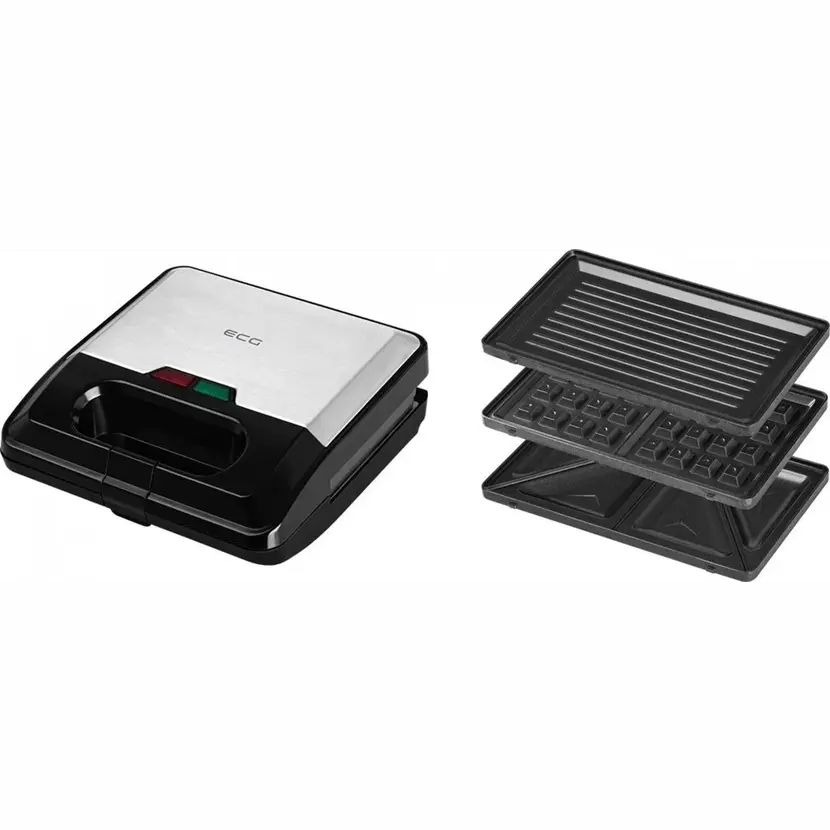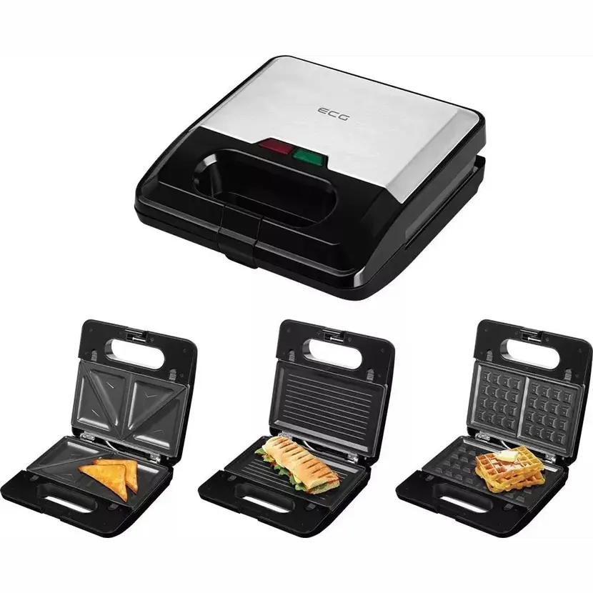 Snídani, oběd nebo večeři si snadno připravíte v sendvičovači ECG S 3173 3in1 Triangle. Černé provedení v kombinaci s nerezem se hodí do každé kuchyně. Díky třem sadám výměnných desek si připravíte chutné sendviče ve tvaru trojúhelníku, křupavé panini, nebo vláčné vafle. Díky odnímatelným deskám a nepřilnavé úpravě pečicích ploch se sendvičovač snadno udržuje čistý. Nemusíte se obávat popálení, protože madlo přístroje je tepelně izolované. Při přípravě vašeho oblíbeného toustu nebo vaflí nemusíte přemýšlet o potřebném času na ideální přípravu. Pomocí kontrolky zjistíte, jestli je sendvičovač v provozu a plochy jsou již nahřáté na provozní teplotu. Pogumované nožičky udrží přístroj stabilní a nepohne se ani na mokré kuchyňské lince.