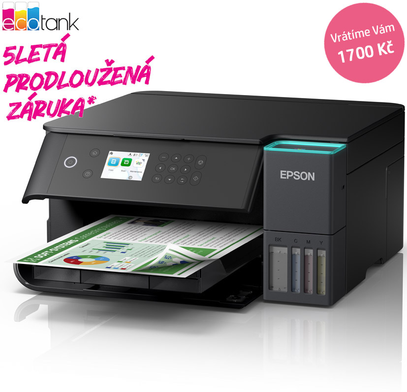 Ušetřete až 95 % nákladů na tisk* s tiskárnami EcoTank od společnosti Epson bez inkoustových kazet. Integrované inkoustové nádržky se snadno doplňují díky speciálně navrženým velkoobjemovým lahvičkám s inkoustem. Bez nutnosti výměny inkoustových kazet a s flexibilními funkcemi připojení je to dokonalá tiskárna pro každého, kdo hledá vysoce kvalitní výtisky za neuvěřitelně nízké náklady na tisk jedné strany.