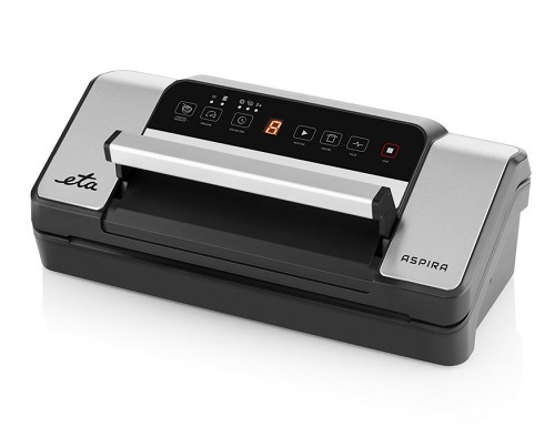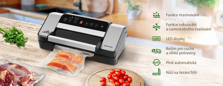 Plně automatická svářečka fólií ETA Aspira 7762 90000 dokáže výrazně prodloužit životnost potravin a uchovat je déle plné chuti. Vakuovačka disponuje režimem pro suché a vlhké potraviny a dvěma intenzitami vakuování, a to normální nebo jemné. LED displej svářečky přehledně ukáže zvolené nastavení. Pro rychlé naložení potravin můžete zvolit unikátní funkci pro marinování. Přístroj lze využít i pro ochranu dokumentů či cenností před vlhkostí a nežádoucími vlivy. ETA Aspira je opatřena bezpečnostní tepelnou pojistkou proti přehřátí a světelnou signalizací provozu.