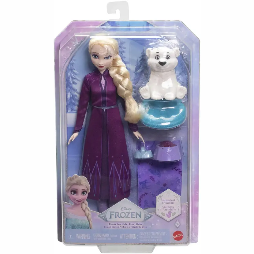 Oficiální sada Frozen Elsa představuje panenku Elsu společně s roztomilým polárním medvídětem, které děti znají z Ledového království. Elsa má dlouhé česatelné vlasy a je oblečená do zimního outfitu s fialovými šaty a vysokými botami, které lze snadno sundat a znovu obléknout, což je ideální pro kreativní hraní. Panenka má ohybná kolena, takže ji lze snadno nastavovat do různých herních pozic.