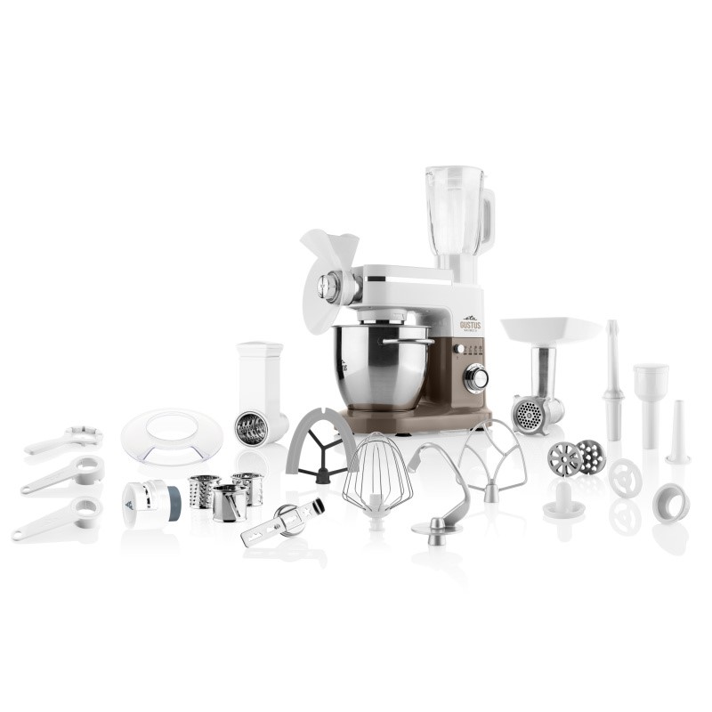 * Mlýnek na maso o průměru 54 mm (3 velikosti mlecích destiček pro střední, hrubé a velmi hrubé mletí, nástavec na výrobu uzenin, nástavec na výrobu Kebbe, tvořítko na cukroví, násypka, pěchovadlo, uvolňovací klíč)