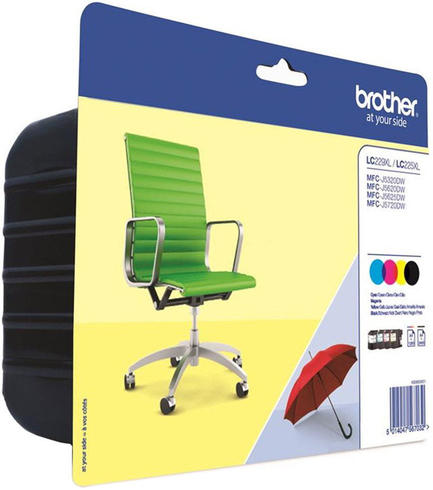 Výměna originálních inkoustových kazet Brother je bezproblémová a cenově co nejvíce dostupná. Černá, azurová, purpurová a žlutá inkoustová kazeta Brother LC229XLVALBP. Černá kazeta vytiskne 2 400 stran a barevné kazety vytisknou 1200 stran.