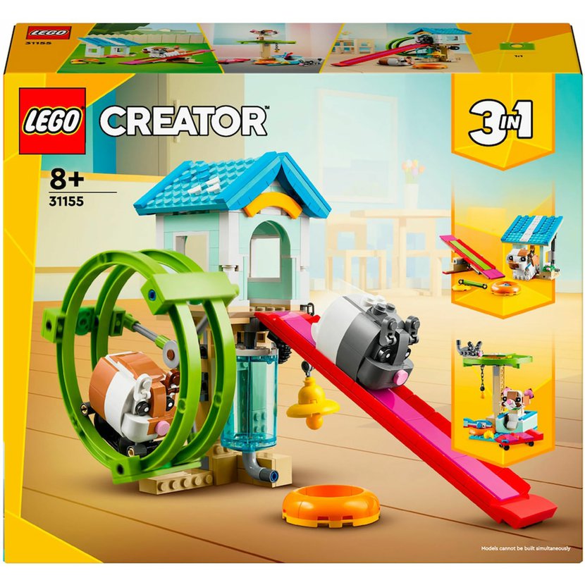 Děti od 8 let a milovníci zvířat si s rozkošnou stavebnicí 3 v 1 Kolotoč pro křečka (31155) užijí spoustu zábavy. Součástí je interaktivní domeček na hraní s kolečkem, ve kterém si jeden z křečků zaběhá, a skluzavkou, z níž se sklouzne druhý křeček. Nechybí řada zábavných doplňků, jako je napáječka na vodu, pneumatika, visící zvonek a miska na krmivo.