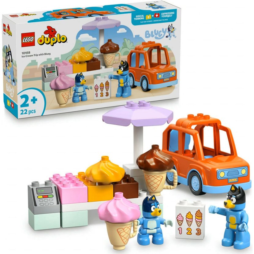 Batolata procvičí svou dovednost poznávání čísel tím, že si vyberou, kolik kopečků zmrzliny chtějí, a naskládají na sebe správný počet kostek. Začnou také třídit barvy při nabírání příchutí a procvičí si jemnou motoriku při umisťování zmrzliny na kornouty. Stavebnice LEGO DUPLO Bluey umožňují malým dětem a jejich rodinám přehrávat si každodenní činnosti a přemýšlet, jak se při těchto činnostech cítí. Stavebnice obsahuje 22 dílků.