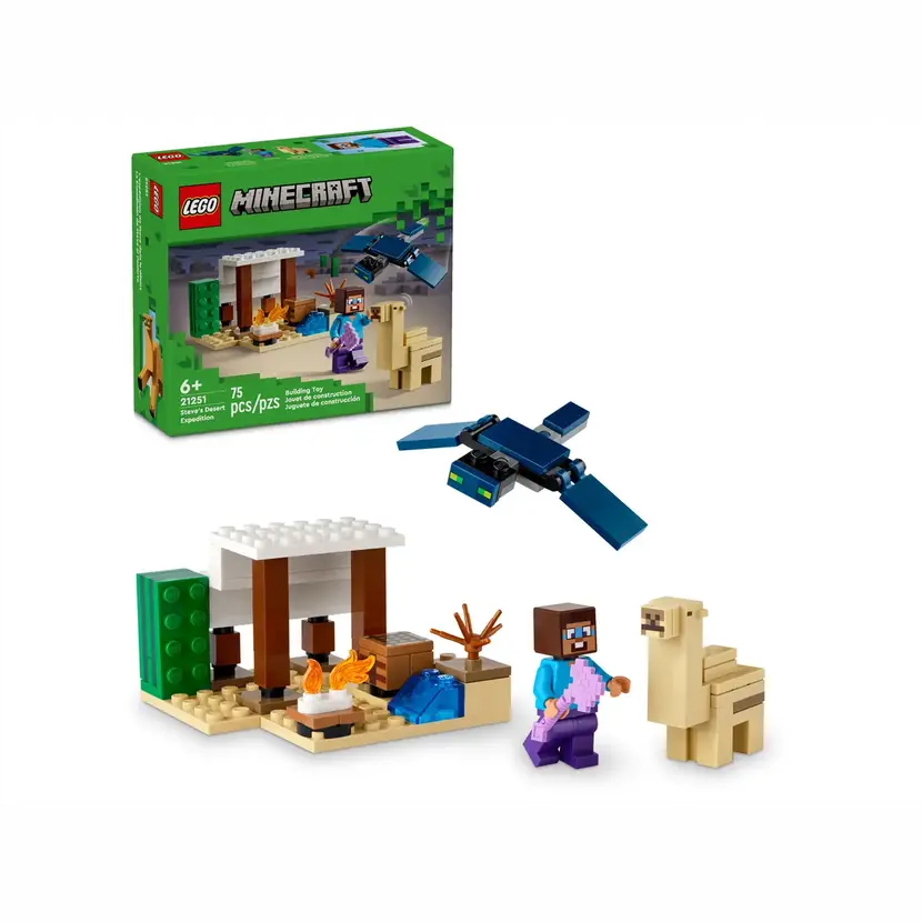 Tato stavebnice LEGO® Minecraft® pro malé stavitele od 6 let je zcela první sada s biomem pouště ze světa Minecraftu. Steve a výprava do pouště (21251) děti inspiruje k postavení domku v nehostinném prostředí, který poté musí ubránit před létajícím Přízrakem.