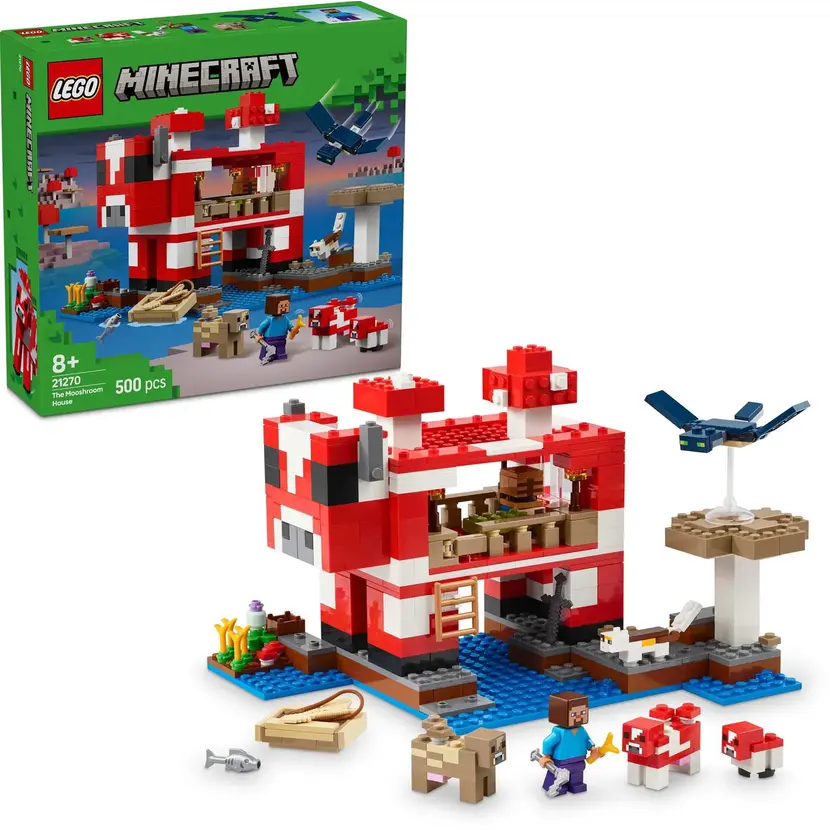 Tato stavebnice LEGO Minecraft se nachází na houbovém ostrově a obsahuje oblíbenou postavu Steva, červenou krávomůrku, malou červenou krávomůrku, hnědou krávomůrku, tříbarevnou kočku a nepřátelský létající přízrak. Stavebnice je plná prvky, které se objevují ve hře, včetně malé farmy s pšenicí, houbami a rostliny rostoucí vedle kompostéru. Mezi doplňky najdete rybářský prut, tresku, motyku, netheritový meč, misku, loďku s vesly, truhlu, pec, pracovní stůl, knihovnu, chléb a postel. S aplikací LEGO Builder si děti užijí ještě větší porci zábavy. Umožní jim na jejich zařízení přibližovat a otáčet modely ve 3D.
