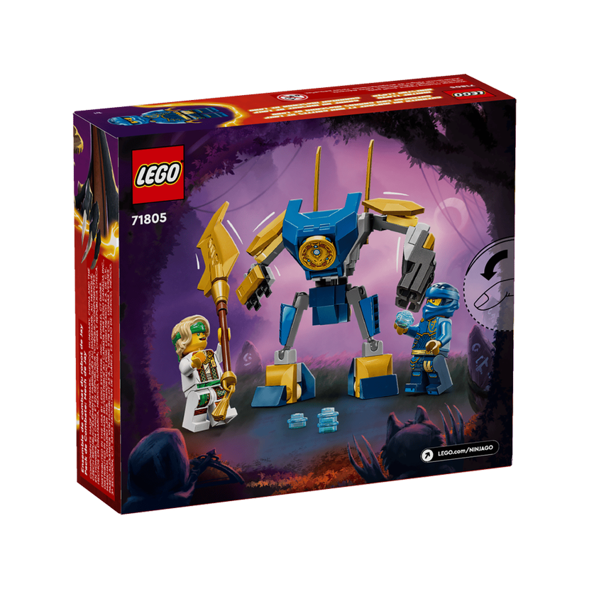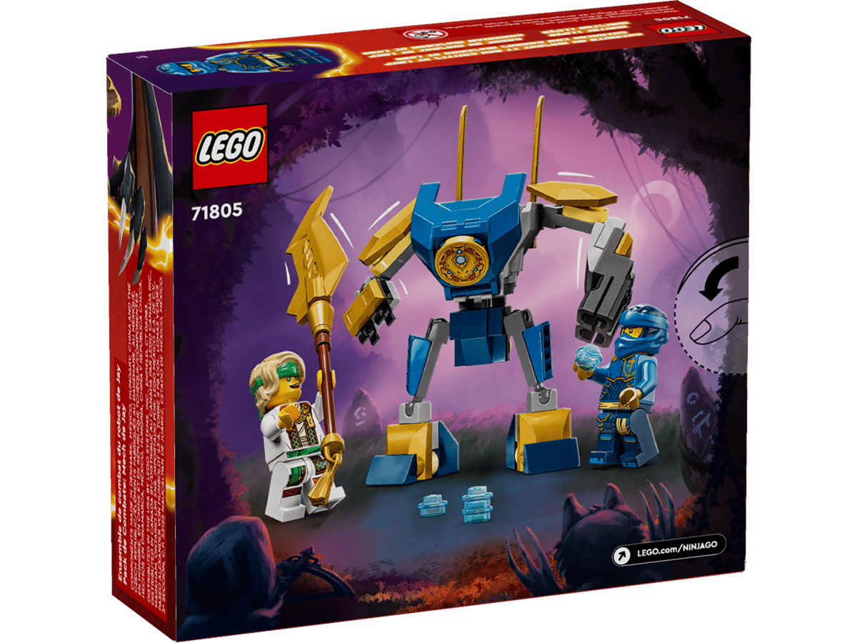 Děti od 6 let se stavebnicí LEGO® NINJAGO® (71805) Bojový balíček Jayova robota znovu prožijí akční bojové scény z 2. řady televizního seriálu NINJAGO® Dračí povstání. Součástí této nindžovské stavebnice je robotický oblek s pohyblivými pažemi, nohama a trupem, který třímá velký zlatý meč a střílí ze 2 vystřelovačů.