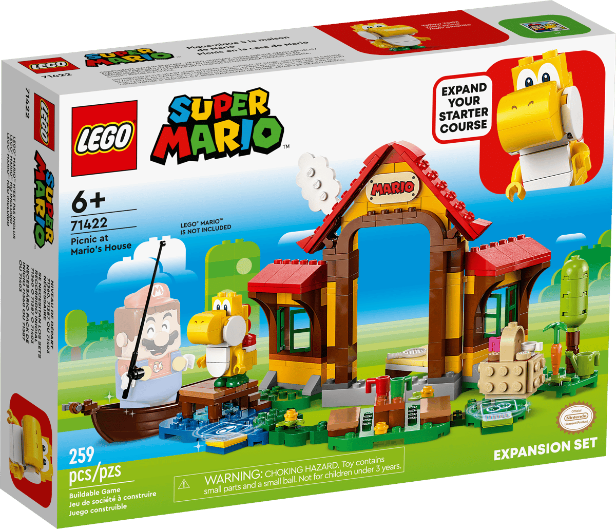 S tímto cool rozšiřujícím setem LEGO® Super Mario™ (71422) Piknik u Maria vytvořit novou zábavnou úroveň. Domek a zahrada z kostek jsou detailně propracované a nabízejí mnoho příležitostí k hraní rolí a způsobů, jak mohou hráči získat digitální mince s interaktivními figurkami LEGO® Maria, LEGO® Luigiho nebo LEGO® Peach™ (nejsou součástí balení). Pozdravte Yellow Yoshiho, vyspěte se na posteli, „pochutnejte si“ na sušenkách z piknikového koše, „zalijte“ zeleninu na zahradě, hrajte hokej nebo vyrazte s loďkou na ryby. Poznámka: Pro interaktivní herní zážitek je zapotřebí některý z interaktivních setů 71439, 71440 nebo 71441, prodáváno samostatně)