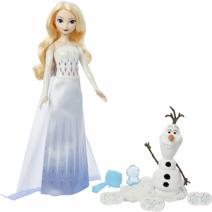 Tento dobrodružný set inspirovaný filmem Disney Ledové království 2 obsahuje módní panenku Elsu a figurku Olafa, která se může proměnit v razítko! Děti mohou na spodní část Olafa připevnit 4 různá razítka a vytvářet hravé tvary ve "sněhu" (bílý tvarovatelný písek).