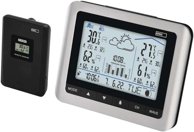 Zajímá vás, jaké jsou největší benefity této domácí meteostanice? Kromě měření vnitřní a vnější teploty a vlhkosti je to zejména měření a záznam hodnoty tlaku, předpověď počasí, datum, funkce DCF nebo zobrazení fáze měsíce.