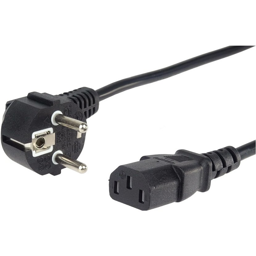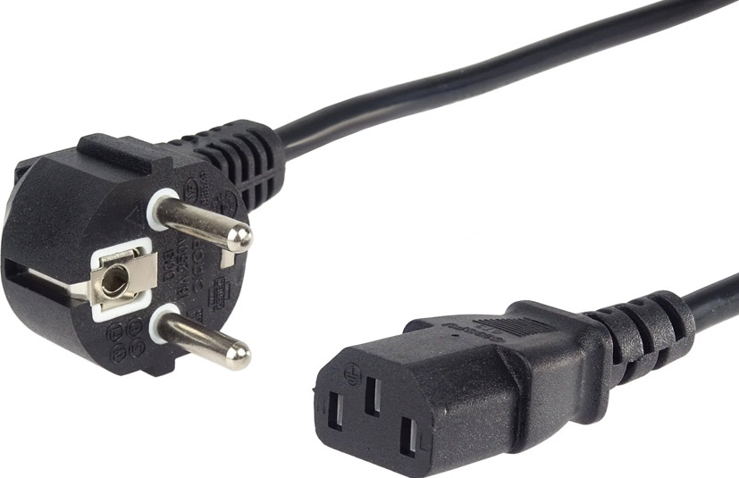 Napájecí kabel v černém provedení pro počítač nebo monitor. Třížilový kabel je zakončený standardní přístrojovou zástrčkou.