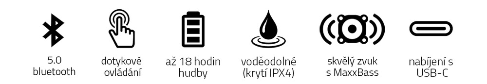 bezdrátová sluchátka • výdrž až 4 hod nebo 18 hod s nabíjecím pouzdrem • frekvence 20 Hz až 15 kHz • citlivost 102 dB • odolnost IPX4 • 13mm měniče • Bluetooth 5.0 • integrovaný mikrofon • technologie MaxxBass pro lepší zvuk
