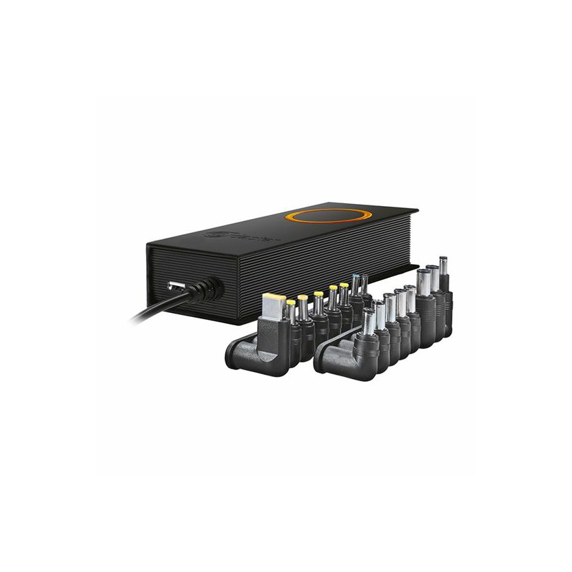 Univerzální napájecí zdroj s automatickým měničem napětí a 16 vyměnitelnými DC konektory pro širokou kompatibilitu notebooků, netbooků a ultrabooků. Výstupní napětí DC 15-20V s maximálním výkonem 90W a USB-A nabíjecí výstup DC 5V/2,1A. Napájení AC 110-240V, 50-60Hz, max. 1.8A. Ochrana proti zkratu a nadproudová ochrana. Délka přívodního kabelu (včetně adaptéru): 2,4 m. Rozměry: 14 x 6 x 3,6 cm, barva: černá.