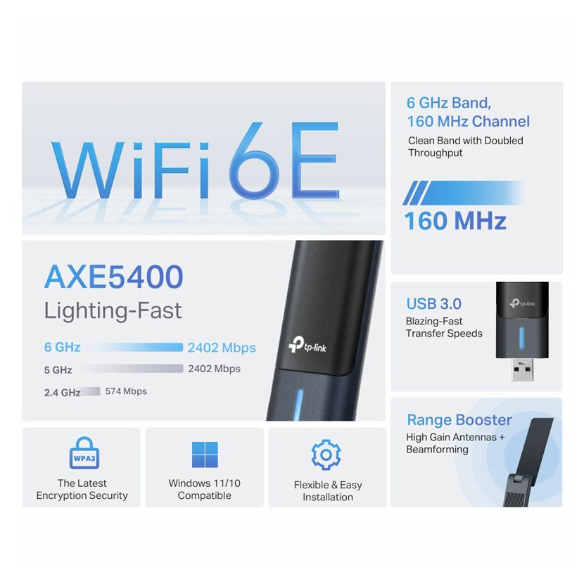 ARCHER TXE70UH - RYCHLEJŠÍ. ŠIRŠÍ POKRYTÍ. NEZASTAVITELNÉ - Wi-Fi 6E USB adaptér s vysokým ziskem AXE5400