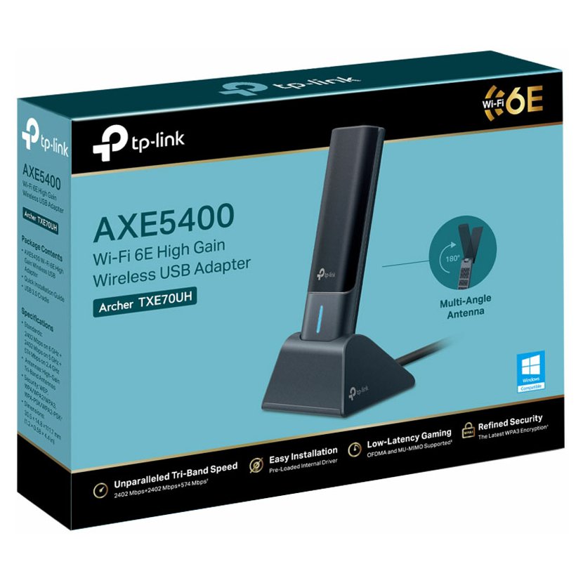 Package Content: AXE5400 Wi-Fi 6E High Gain Wireless USB Adapter Archer TXE70UH, Quick Installation Guide, USB 3.0 Cradle