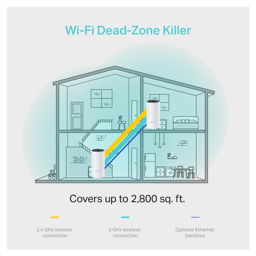 Deco M4 je nejjednodušší způsob, jak zaručit silný Wi-Fi signál v každém rohu vašeho domu až do 2 800 čtverečních stop (balení po 2 jednotkách, verze pro EU). Bezdrátové připojení a volitelný ethernetový backhaul spolupracují k propojení jednotek Deco a poskytují ještě vyšší rychlost sítě a skutečně bezproblémové pokrytí.