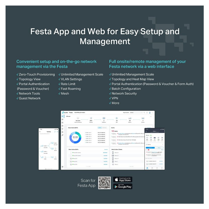 - Snadné nastavení a použití: Není třeba profesionální IT technik. Aplikace Festa, samoorganizující se sítě a technologie Zero-Touch Provisioning to usnadňují.