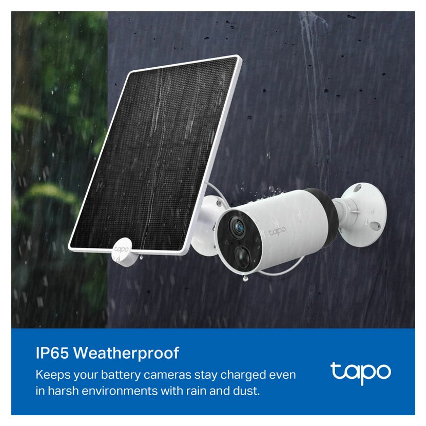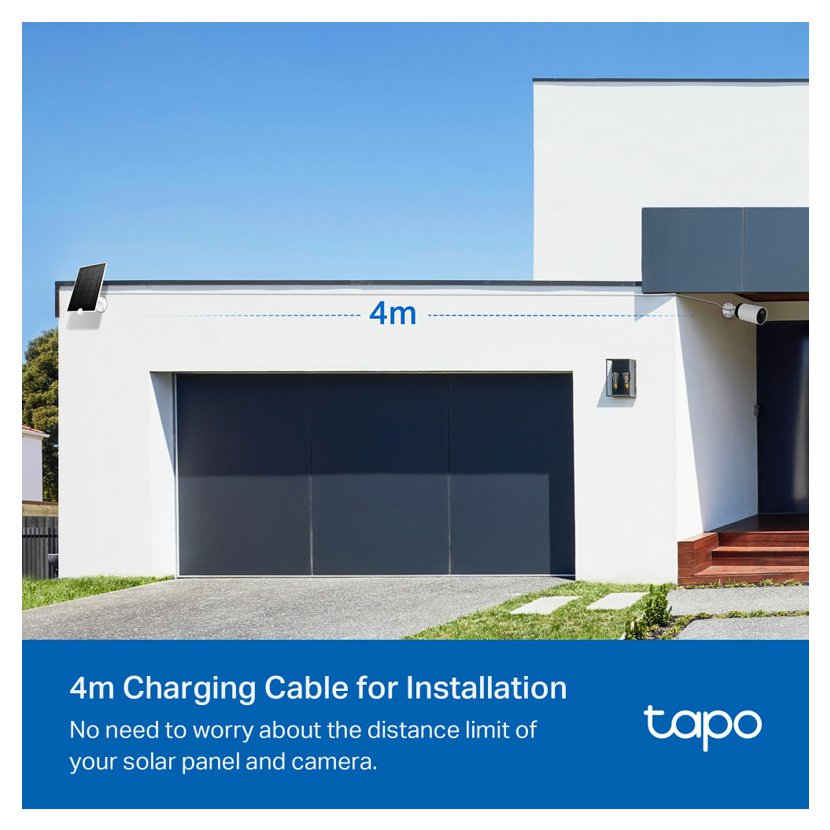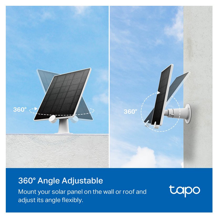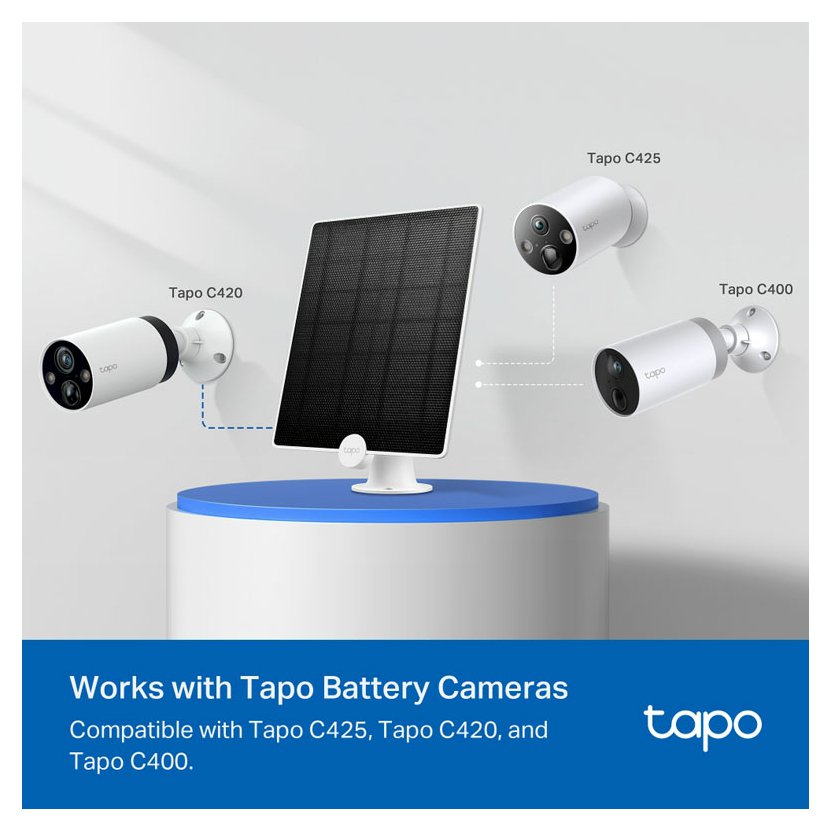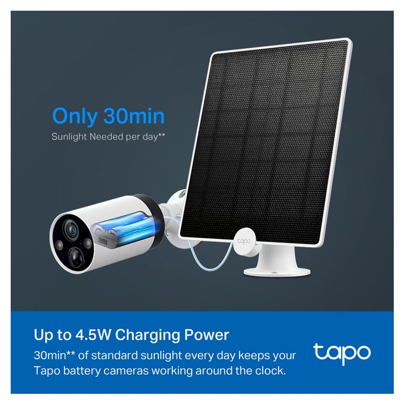 - Nonstop solární napájení - zachycuje bezplatnou, čistou solární energii a zajišťuje nepřetržité napájení bateriových kamer Tapo (Tapo C425, Tapo C420 a Tapo C400), které vás chrání po celý rok.