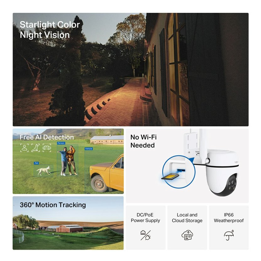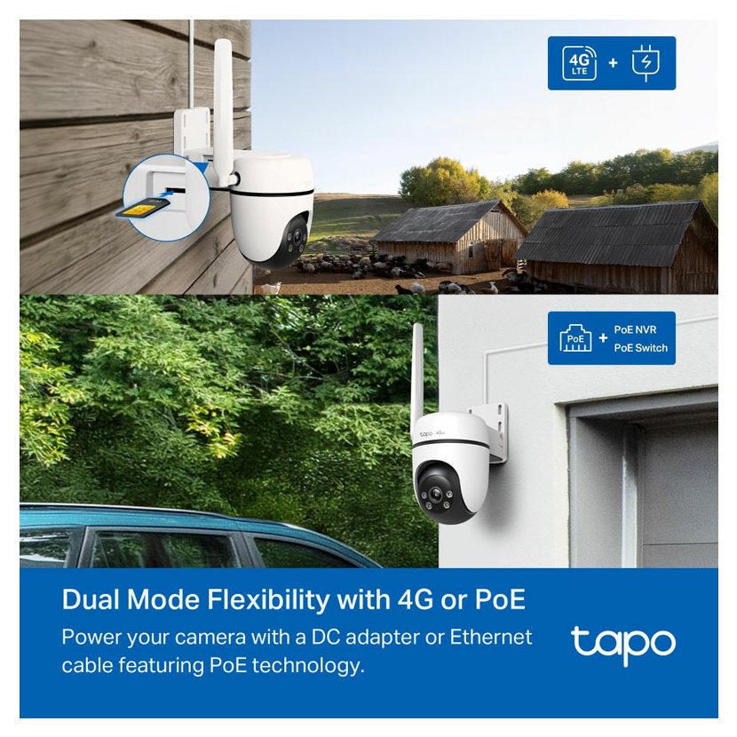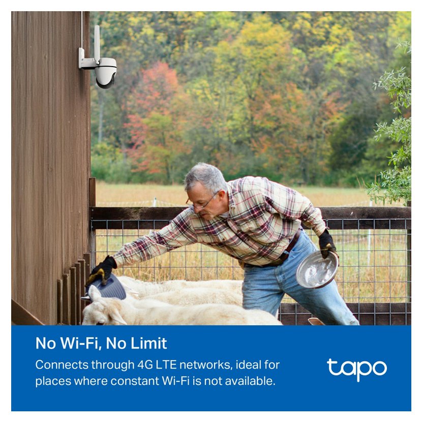 Díky zkušenostem společnosti TP-Link v oblasti sítí 4G se Tapo C501GW spolehlivě připojuje prostřednictvím sítí 4G LTE, což je ideální pro místa, jako jsou garáže, rekreační domy, sklady a farmy, kde není k dispozici stálá Wi-Fi. Pro snadné a bezproblémové nastavení internetu stačí připojit kartu SIM 4G (není součástí balení).