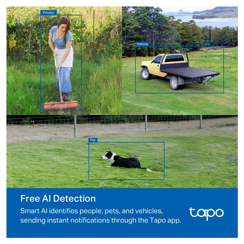 - AI detekce zdarma: Inteligentní umělá inteligence rozpoznává osoby, domácí zvířata a vozidla a zasílá okamžitá upozornění prostřednictvím aplikace Tapo.