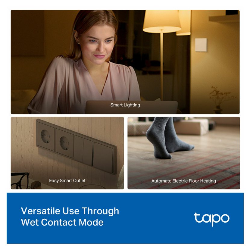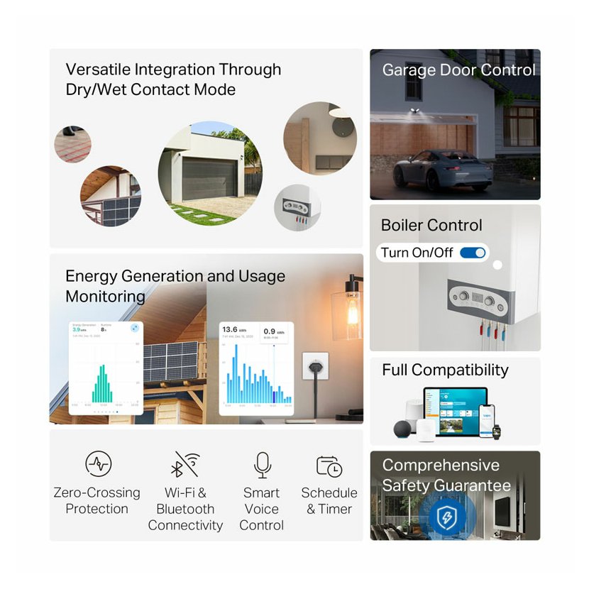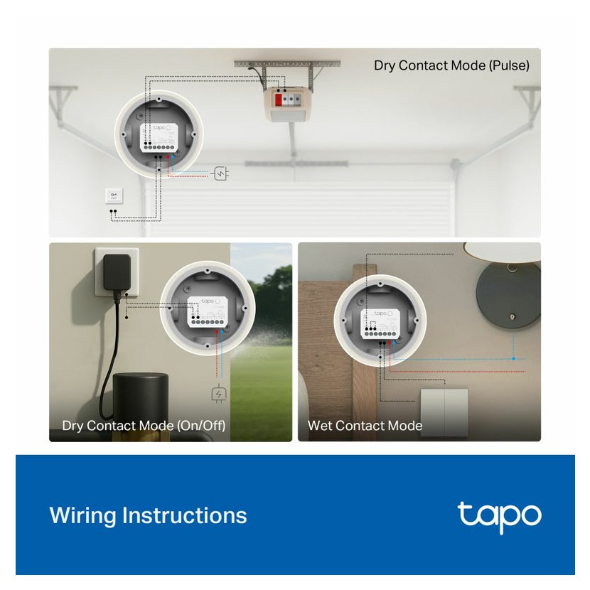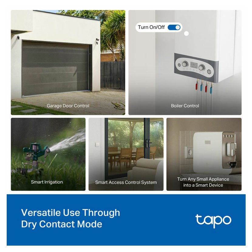 Tapo S110E podporuje duální režimy, ideální pro širokou škálu aplikací. V **režimu suchého kontaktu** je perfektní pro ovládání garážových vrat, bojlerů, zavlažovacích a postřikovacích systémů, systémů kontroly přístupu a dalších. V **režimu mokrého kontaktu** bez námahy ovládejte chytrá světla, zásuvky a elektrické podlahové topení, aniž byste museli vyměňovat stávající
