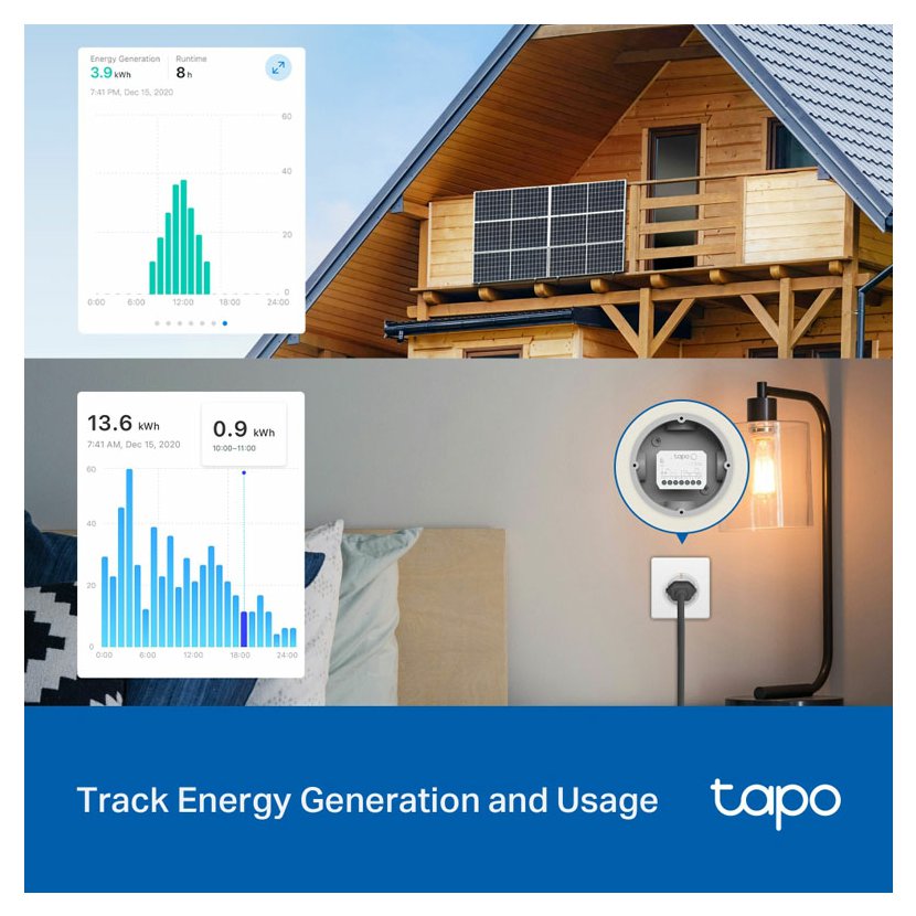 - Sledování výroby a spotřeby energie – Tapo S110E je vybaven pokročilým hardwarem, který automaticky rozpoznává směr proudu, a nabízí tak skutečný plug-and-play zážitek bez nutnosti ručního nastavení.