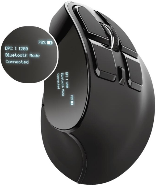 Bezdrátová dobíjecí ergonomická myš Trust Voxx disponuje praktickým stavovým LED displejem, na kterém můžete sledovat důležitá nastavení, jako je funkčnost tlačítek, aktuální hodnotu DPI, stav připojení či zbývající kapacitu baterie.