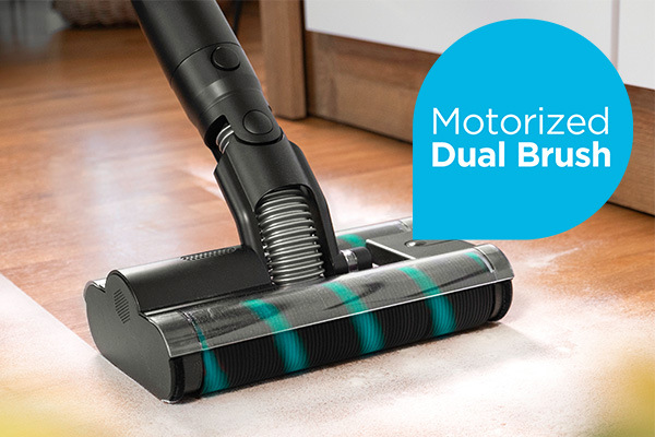 Spolu s vysavačem dostanete inovativní turbokartáč Dual Brush. Tvoří ho dva kartáče z jemného mikrovlákna, které rotují proti sobě, takže dokážou odstranit z podlahy prach do posledního smítka. Ten následně zamíří do 200ml nádobky na nečistoty, kterou snadno vysypete přímo do koše, aniž by vaše ruce přišly se špínou do kontaktu.