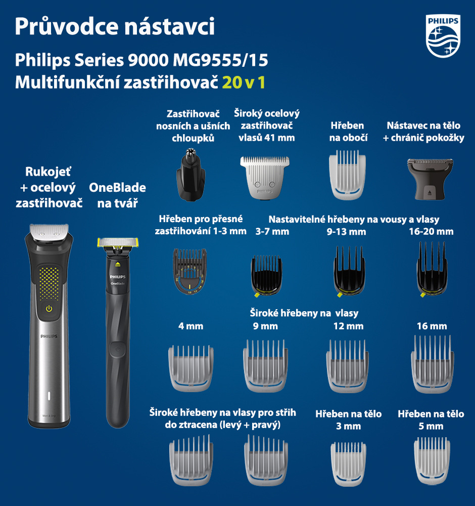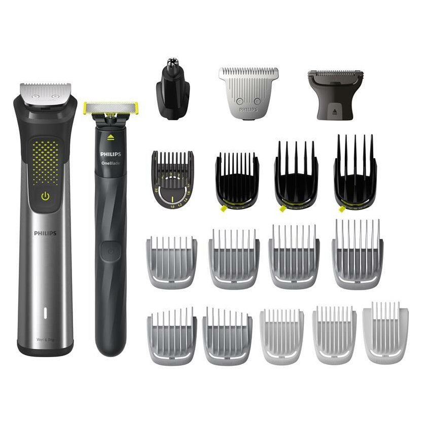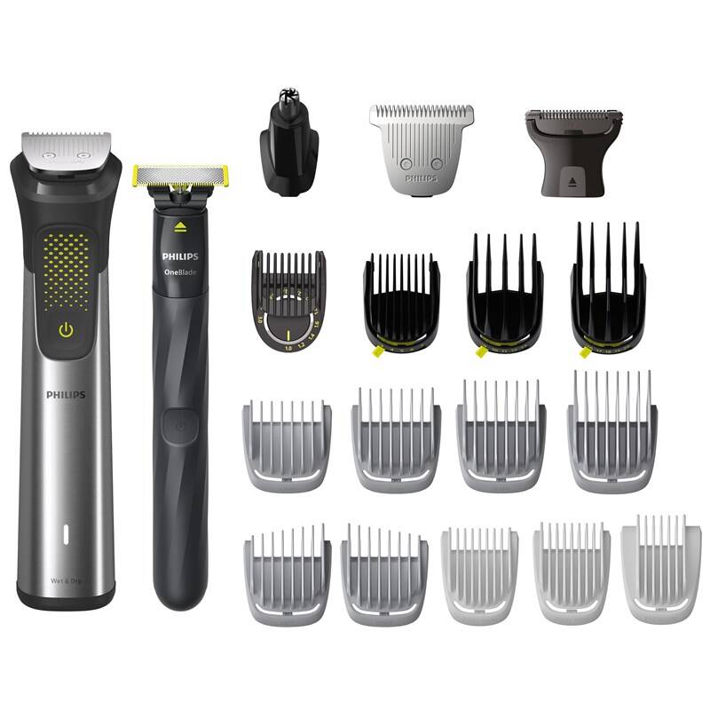 Vše, co k úpravě vousů, vlasů, obočí a chloupků na těle potřebujete, je součástí balení. Kombinace multifunkčního zastřihovače Philips Series 9000 a inovativního zastřihovače Philips OneBlade vám umožní své své tělo od hlavy až k patě upravit přesně podle vašich představ.
