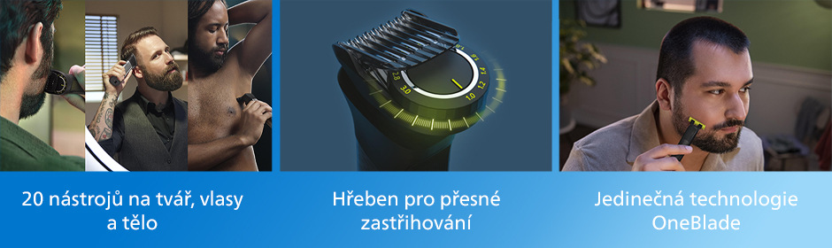 multifunkční zastřihovač • výdrž baterie 120 min. • samoostřicí kovové břity • zastřihování vlasů, vousů, těla 0,2–20 mm • voděodolný • BeardSense – přizpůsobuje výkon • rychlonabití za 5 minut (na 1 zastřižení) • indikátor baterie • rukojeť a břit OneBlade • sada 20 nástavců
